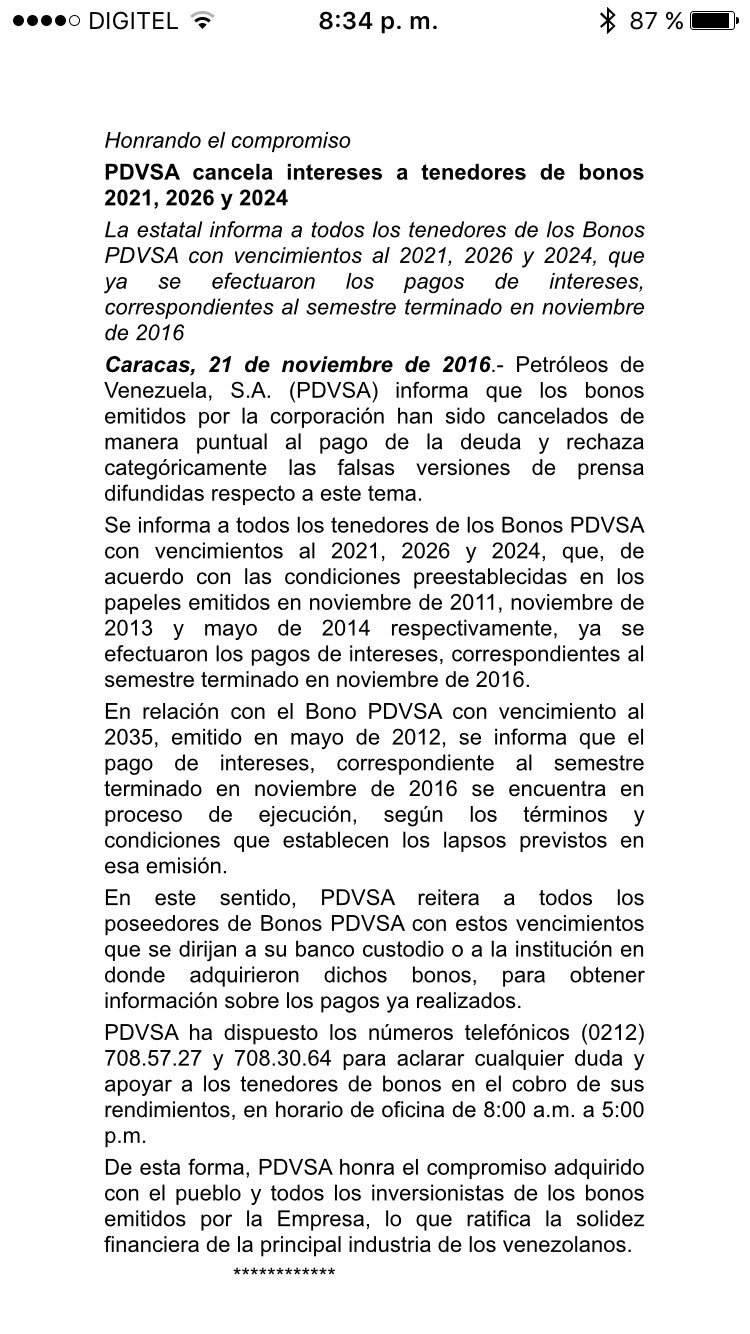 A continuacion nota emitida por la estatal Petrolera PDVSA, y transmitida por su Presidente Eulogio del Pino desde su cuenta twiotter @delpinoeulogio; donde da por falsa la informacion contenida en la nota emitida por la banca de Inversion JP Morgan, donde dan cuenta de un impago de los rendimientos de los bonos PDV2021, 2024 y 2031 (ver JP MORGAN: PDVSA no cancela intereses de Bonos 2021, 2024 y 2035 y activa periodo de gracia.).